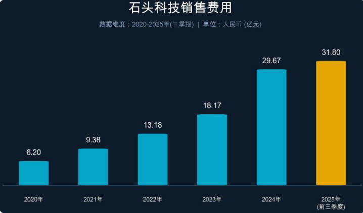 而 为了维持销量的快速增长,石头科技 不断 砸钱做营销,2025年前三季度,其销售费用高达31.80亿元,同比暴涨103.42%,远超72.22%的营收增速。销售费用率从2023年的19.79%攀升至2025年三季度末的26.35%。这意味着,公司每赚取100元收入,就有 超过26元要重新投入到广告、明星代言和渠道铺设中,而留存到净利润的只有8.6元,这种“烧钱换规模”的模式不断侵蚀石头科技的净利润。