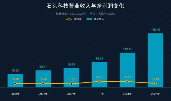 不过 在 业绩 方面 , 石头 科技 的 营业 收入 仍 保持 在 较高 的 增速 , 业绩 快报 显示 , 石头科技 2025年实现营收186.16亿元 , 创下历史新高 , 同时根据 其 公告 援引 的 IDC最新报告 数据 , 石头科技 智能扫地机器人在全球市场上的销额及销量份额居全球第一。