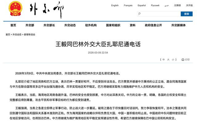 3月9日,中共中央政治局委员、外交部长王毅同巴林外交大臣扎耶尼通电话。