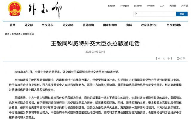 王毅表示,中方一贯主张通过政治和外交手段解决争端,目前的战事是一场本不应发生的战争,也是对各方都没有益处的战争。美国和以色列未经联合国授权,在伊美谈判还在进行当中对伊朗发动武力袭击,明显违反国际法。同时,海湾国家的主权、安全和领土完整也应得到充分尊重,任何攻击无辜平民和非军事目标的行为都应受到谴责。当务之急是尽快停火止战。海湾国家一直呼吁对话谈判,中方对此表示赞赏。中方将继续为争取和平作出努力,中国政府中东问题特使目前已赴地区斡旋,将同科方及其他国家加强沟通交流。希望并相信科方会维护中方在科机构和人员安全。